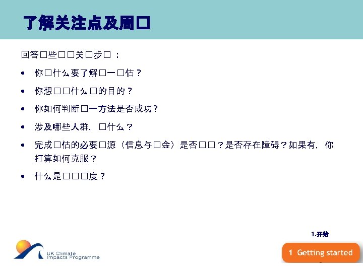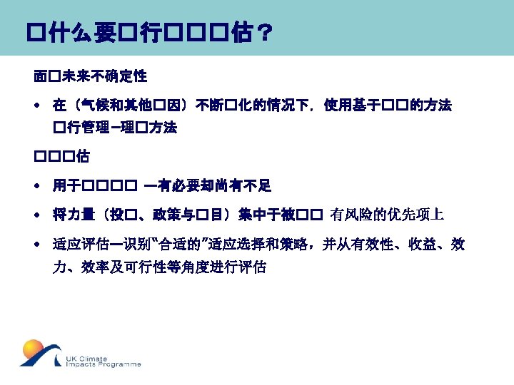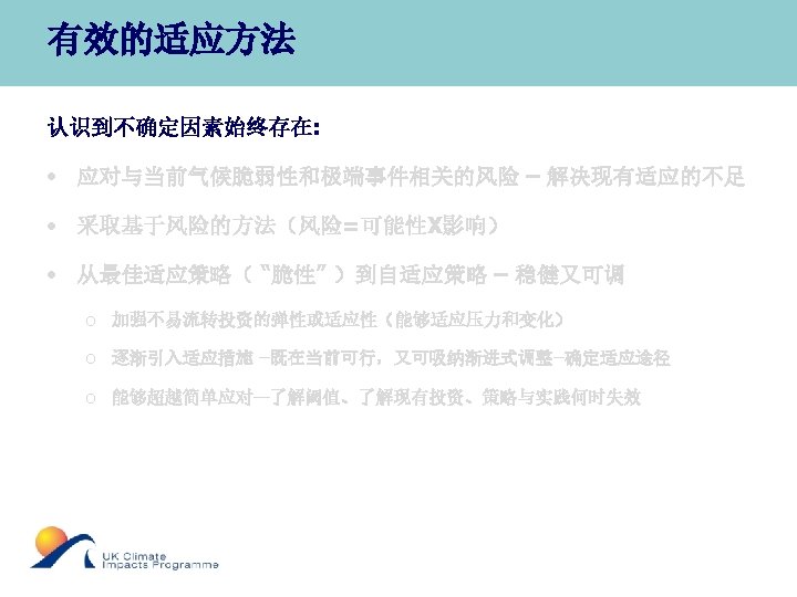 Supporting Effective Adaptation An on-line tool to help organisations adapt to climate change Adaptation Wizard • http: //www. ukcip. org. uk/index. php? option=com_content&task=view&id=147&Ite mid=297 • Based on “risk and uncertainty in decision-making” framework • Shares the risk framework’s intellectual basis and key concepts, but is presented in a “lighter”, action–oriented style.