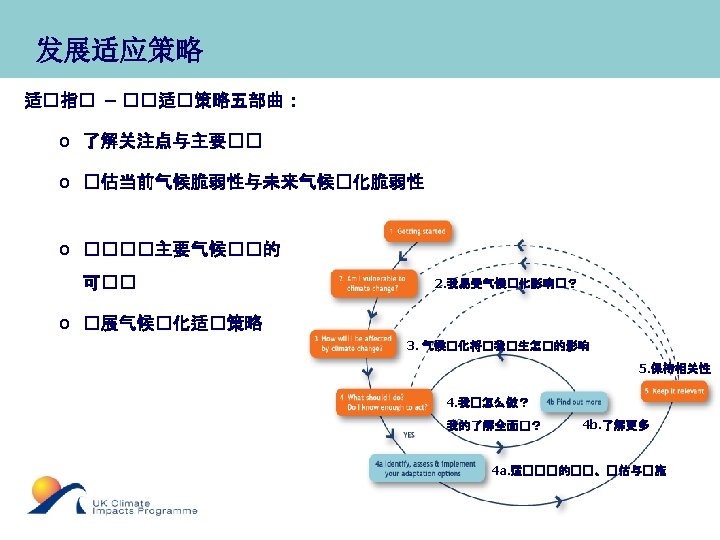 Developing an adaptation strategy Adaptation Wizard – a 5 step process that facilitates exploration by those using it to: o Understand key concerns and issues o Assess vulnerability to current climate and future climate chang o Identify options to address key climate risks o Develop a climate change adaptation strategy