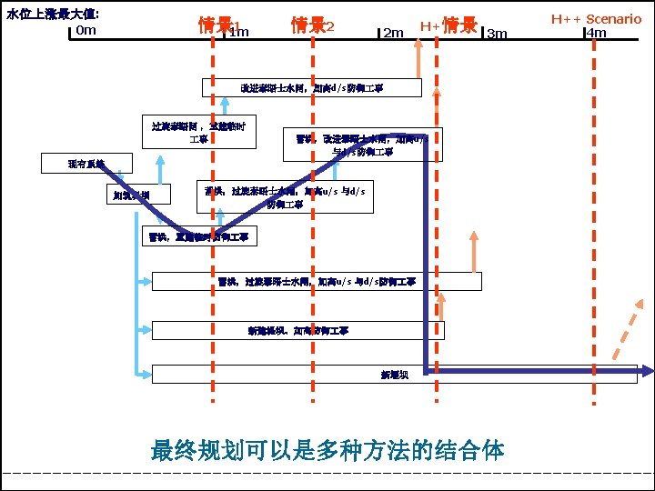 Scenario 1 1 m Max water level rise : 0 m Scenario 2 2 m H+ Scenario 3 m H++ Scenario 4 m Improve Thames Barrier and raise d/s defences Over-rotate Thames Barrier and restore interim defences Existing system Raise Defences Flood storage, improve Thames Barrier, raise u/s & d/s defences Flood storage, over rotate Thames Barrier, raise u/s & d/s defences Flood storage, restore interim defences New barrier, retain Thames Barrier, raise defences New barrage The final plan may be a combination of approaches