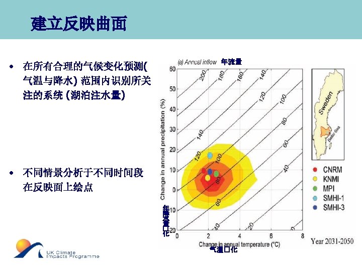 Developing a Response Surface • Identifying the behaviour of the system of interest (inflow into a lake) with projected changes in climate (temperature and precipitation) across plausible ranges • Different scenarios at different time periods plotted on this