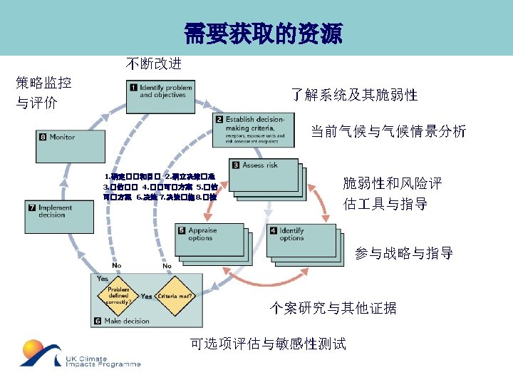 Resources Needed to Support Monitoring and Evaluation Strategies Continuous improvement Understanding of system and its vulnerabilities Current climate and climate scenarios Vulnerability and risk assessment tools and guidance Engagement strategies and guidance Case studies and other evidence Options evaluation and sensitivity testing