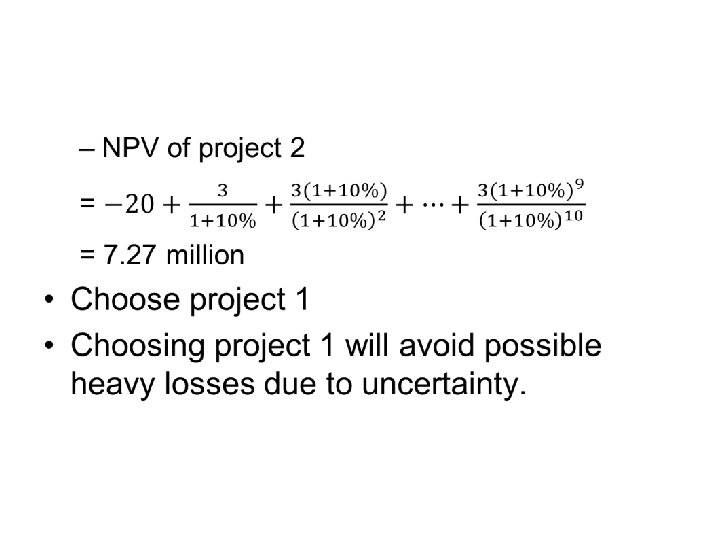 Projects with different length • In earlier examples, we assume project duration is one year. • Project length may be different from one year. • We can perform the same calculation.