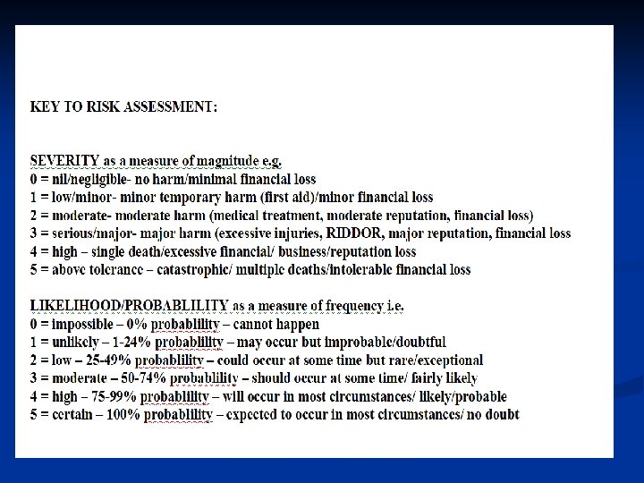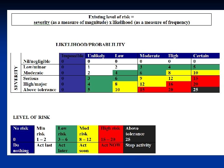 Evaluate the risks § After establishing ‘Likelihood’ and ‘Consequence’ you can use a table like this to set a level of risk. Extreme Very high Moderate Low Negligible Almost certain Severe High Major Moderate Likely Severe High Major Significant Moderate Low Unlikely Major Significant Moderate Low Very low Rare Significant Moderate Low Very low Very Low