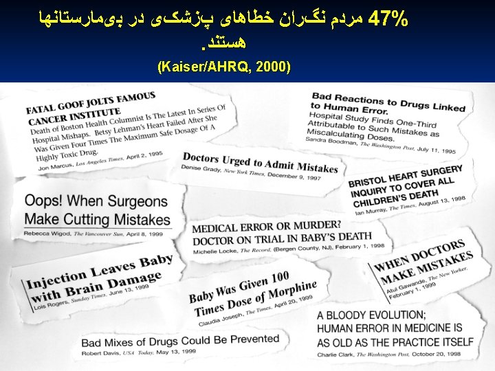 What does a 2 -4% adverse event rate mean? Brenan (2000) n 0. 1% Rate: n n n n 1 hour of unsafe drinking water every month 2 unsafe plane landings per day at O’Hare Airport in Chicago 16, 000 pieces of mail lost every hour 22, 000 checks deducted from the wrong bank account each hour 20, 000 incorrect prescriptions every year 500 incorrect operations each week 50 babies dropped at birth every day Multiply by 20 -40 to reflect a 2 -4% error rate!