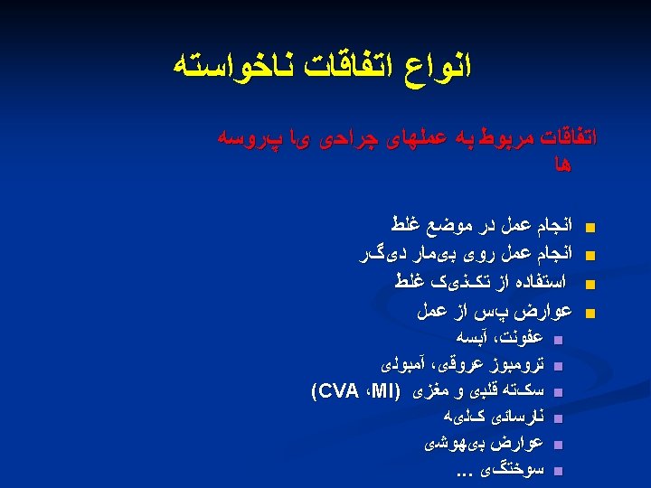 Sentinel events n Procedures involving wrong patient or body part n Retained instruments after surgery n Intravascular gas embolism causing death n Blood transfusion reaction from ABO incompatibility