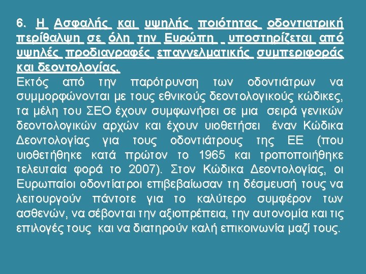 • CED RECOMMENDATIONS TO ITS MEMBER ORGANISATIONS • The CED recommends that its member organisations: • Seek to ensure that patient safety is part of undergraduate and post-graduate dental training curricula, to strengthen further the patient safety culture in healthcare. • Encourage their dentists to be actively aware of the various elements of their professional practice where patient safety can be compromised. • Encourage their dentists and the rest of the dental team to participate in continuing professional development relating to patient safety, to keep knowledge and skills up to date. • Ensure that dentists have a knowledge of languages necessary for practising in their country, in particular in order that they be able to communicate with patients and other professionals. • Seek to ensure that patient data is safely stored and available to health professionals as and when required, in accordance with national law. • Ensure official registration of qualifications of dentists. • Ensure transparency of the qualifications and competences of all other members of the dental team, as required by national law. • Consider establishing “study groups” to provide a forum for local dentists to discuss experiences openly and learn from each other. • Seek to introduce national systems for voluntarily and anonymously reporting adverse events, near misses and problems with medical devices, to enable all dentists to learn from their own and others’ experiences. • Promote the CED code of ethics and national ethical codes, since strong ethics underpin high quality and safety.