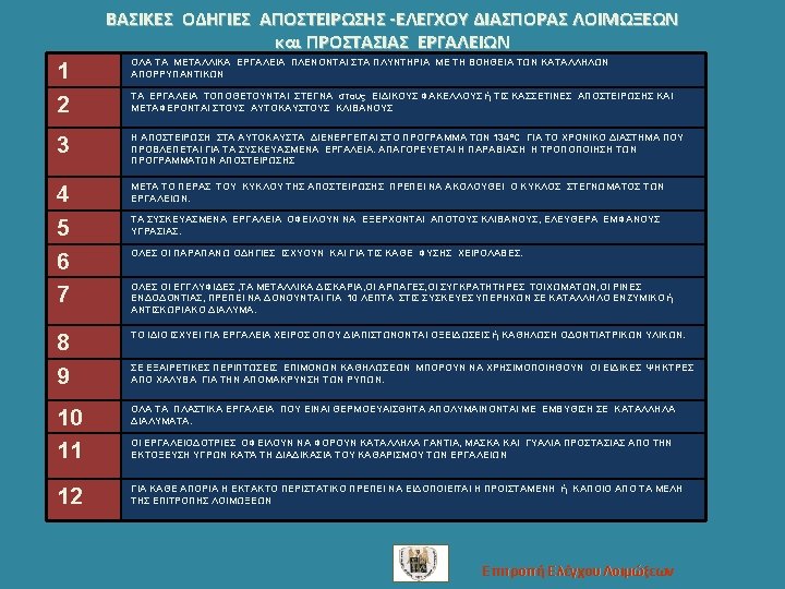 This annex lists CED-agreed voluntary recommendations for the basic procedures necessary to maintain a safe environment for both dental staff and patients. (continues) Recommendation 13: Handpiece sterilization Recommendation 14: Sterilization of burrs and endodontic instrumentation Recommendation 15: Decontamination of equipment Recommendation 16: Decontamination of impression materials Recommendation 17: Decontamination/sterilization of orthodontic appliances Recommendation 18: Handling of blood spills. Recommendation 19: Aerosol splatters. Dental Office air and water quality. Recommendation 20: Waste disposal management Recommendation 21: Amalgam and toxic materials disposal management Recommendation 22: Biopsy tissues, teeth and small tissues management Recommendation 23: Inoculation injuries protocol/Post-exposure prophylaxis (PEP) Recommendation 24: Infected dental personnel