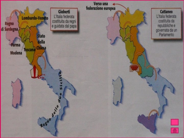 LE IDEE FEDERALISTE � Il “risorgimento” non consisteva per Gioberti nella creazione di una civiltà nuova, bensì nel ritrovamento di una civiltà remota, quella dei Comuni e dei grandi pontefici, nel riannodarsi del filo della storia nazionale al punto in cui le invasioni del secolo XVI lo avevano spezzato. Un “risorgimento” senza rivoluzioni, congiure, spargimento di sangue, con il pieno accordo del Papato e dei principi. Il Papa avrebbe rappresentato un’autorità super partes, conferendo quell’ideale unità cattolica, che poteva risultare l’unica possibile o la più efficace a sul fronte delle rivalità, divisioni e diffidenze regionali.