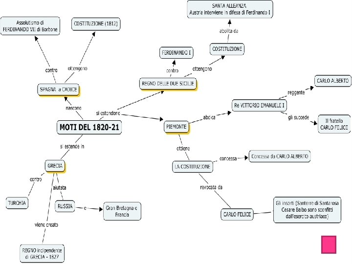Congresso di Vienna Inizia il periodo restaurazione Che riorganizza l’Europa secondo il principi di legittimismo equilibrio ignorava moti 1820 -21 Aspirazioni di libertà che sfociarono nei moti 1830 - 31