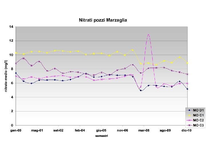 Risorse idriche di Modena: sintesi stato di fatto • S. Cesario: – – • migliori caratteristiche idrochimiche alimentazione principale per Castelnuovo – Castelvetro – Maranello – la parte residuale di S. Cesario viene distribuita a Modena pur essendo nato per la sua alimentazione Modena Sud è di fatto chiuso (funzionamento solo per mantenere attive le pompe sommerse in caso di necessità) • Cognento: – – • Nitrati fuori limiti, utilizzo solo con diluizione in vasca e nei momenti di punta Marzaglia: – – buone caratteristiche idrochimiche la risorsa più importante per Modena