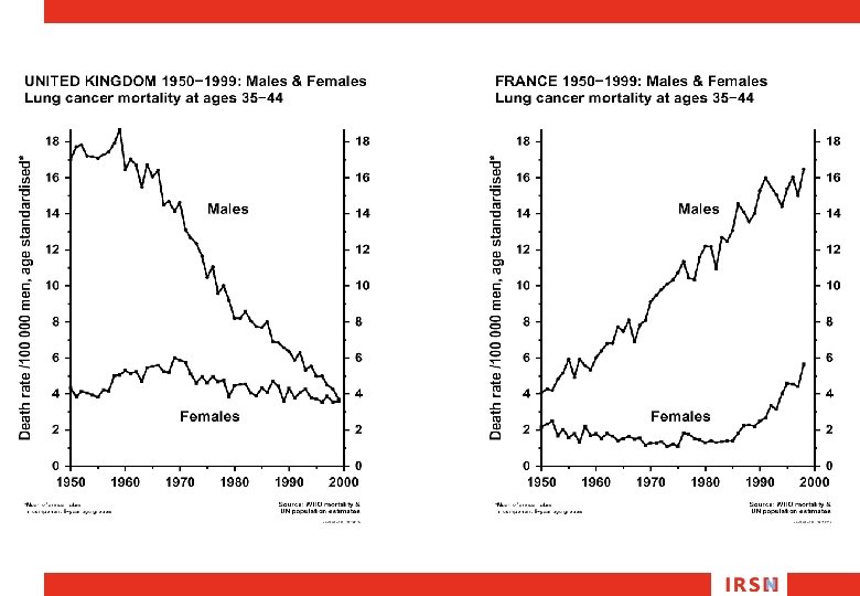 Estimation du risque “vie entière” Approche de la Commission Internationale de Protection Radiologique Probabilité de décéder d’un cancer du poumon Homme de type euro-américain 18 -90 ans (CIPR) Moyenne 6% Si toute sa vie à + 100 Bq. m-3 7. 5% (≠ 1, 5%) Relatif (+25%) Si toute sa vie à + 300 Bq. m-3 11% (≠ 5%) (+80%)