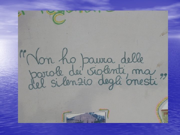 La verità prima o poi vince sempre. Se noi non denunciamo questi atti non la sconfiggeremo mai e per questo come dice Rita Atria “un mondo onesto non esisterà mai”. La mafia non ci da il libero pensiero, ma ci inducono a pensare il loro volere. Però se noi combattiamo pensiamo con la nostra testa e non la loro, e denunciamo questi atti forse riusciremo a sconfiggerla.