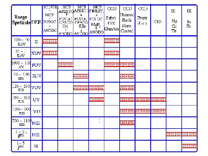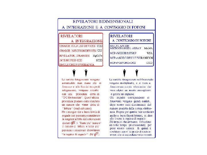 Rumore (noise) Fluttuazioni del segnale rivelato dipendenti da cause diverse, che impongono un limite all’intensità minima di fotoni rivelabile Photon noise Fluttuazioni statistiche del numero di di fotoni che raggiungono il rivelatore in un dato Dt Dark noise Fluttuazioni statistiche di segnali in uscita che si generano in assenza di radiazione incidente Read-out noise Rumore introdotto dall’elettronica associata al rivelatore Risoluzione in energia DE/E Risoluzione spaziale Dx/x Risoluzione temporale Dt/t