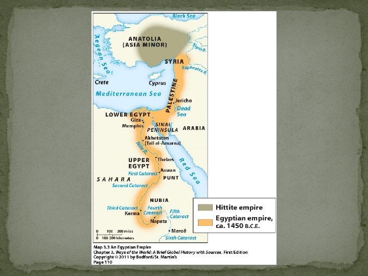 Turmoil and Empire � Period of upheaval after Old Kingdom (2160 -2040 BCE) � Middle Kingdom (2040 -1640 BCE) � Nomadic horsemen, Hyksos, invade Egypt � Using bronze weapons and chariots (Egypt does not have) � Captures Memphis in 1674 BCE � Causes revolts in Upper Egypt � New Kingdom (1550 -1070 BCE) � Pharaoh gains power, huge army, large bureaucracy � Building projects: temples, palaces, statues � Tuthmosis III (1479 -1425 BCE) built empire including Palestine, Syria, and Nubia � Then Egypt falls into a long period of decline � Egyptians driven out of Nubia in 1100 BCE � Nubian Kingdom of Kush; capital is Napata � King Kashta conquers Thebes (in Egypt) in 760 BCE � Assyrians with iron weapons invade from the north � After 6 th century BCE series of foreign conquests