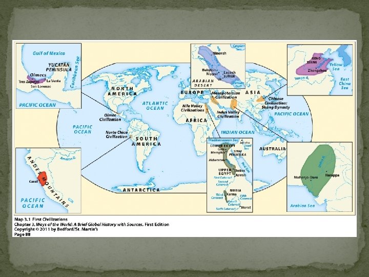 Why focus on Egypt, Mesopotamia, Indus Valley, and China? � Earliest large populations � Development of monumental architecture � Development of writing � Social/economic relationships can be better understood � Religious beliefs � Political/legal systems become clearer