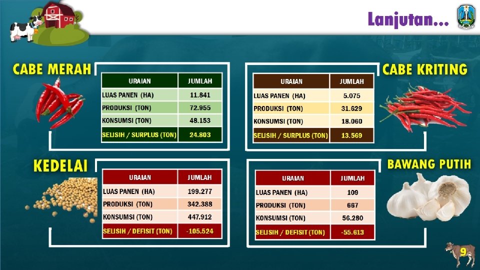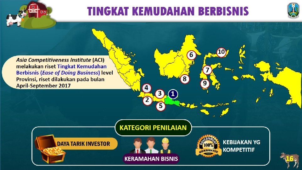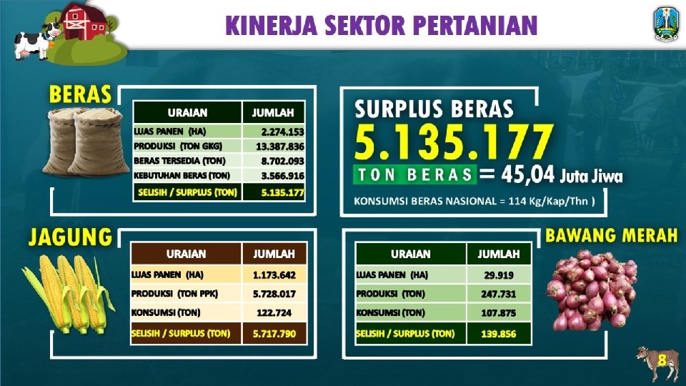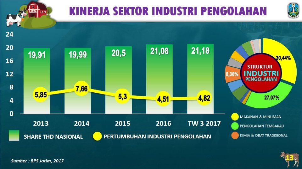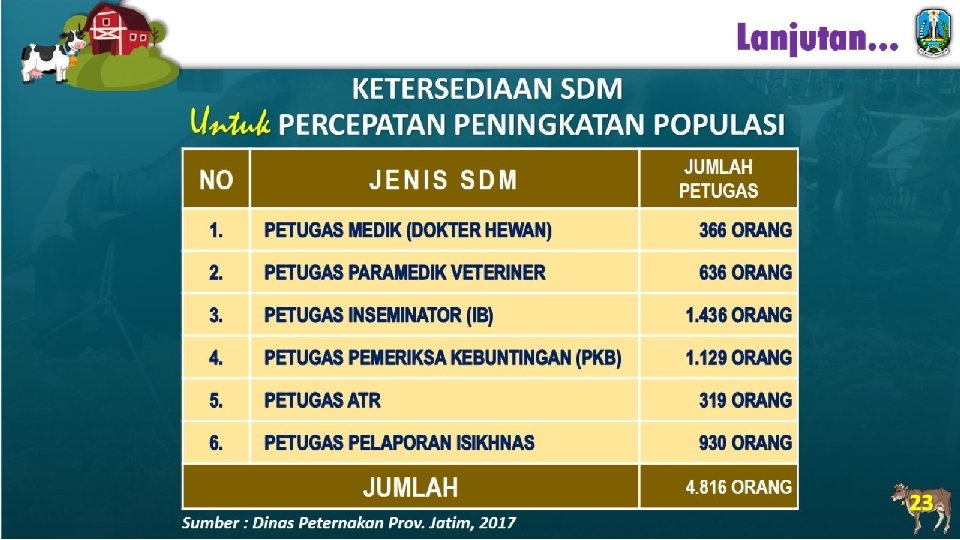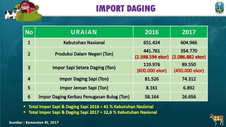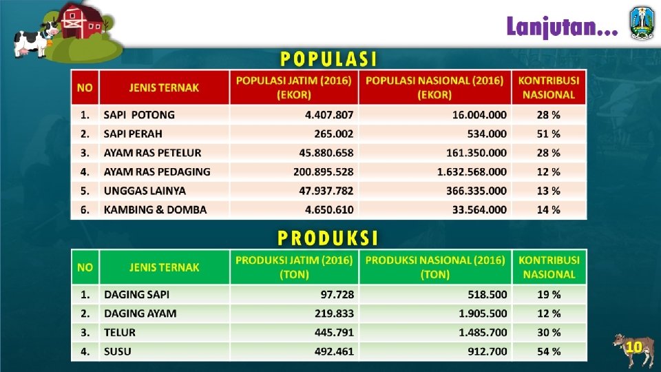 KONTRIBUSI JAWA TIMUR TERHADAP PEMENUHAN KEBUTUHAN PANGAN NASIONAL POPULASI JAWA TIMUR NO JENIS TERNAK POPULASI JATIM (2016) (EKOR) 1. SAPI POTONG 4. 407. 807 16. 004. 000 I 28 % 2. SAPI PERAH 265. 002 534. 000 I 51 % 3. AYAM RAS PETELUR 45. 880. 658 161. 350. 000 I 28 % 4. AYAM RAS PEDAGING 200. 895. 528 1. 632. 568. 000 II 12 % 5. UNGGAS LAINNYA 47. 937. 782 366. 335. 000 II 13 % PRODUKSI JAWA TIMUR 6. NO KAMBING & JENIS KOMODITI DOMBA 1. DAGING SAPI 2. PRODUKSI 4. 650. 610 JATIM (2016) (TON) POPULASI NASIONAL (2016) (EKOR) PERINGK AT NASIONAL KONTRIBU SI NASIONAL PRODUKSI 33. 564. 000 PERINGK II NASIONAL (2016) AT (TON) NASIONAL KONTRIBU 14 % SI NASIONAL 97. 728 518. 500 I 19 % DAGING AYAM 219. 833 1. 905. 500 III 12 % 3. TELUR 445. 791 1. 485. 700 I 30 % 4. SUSU 492. 461 912. 700 I 54 %