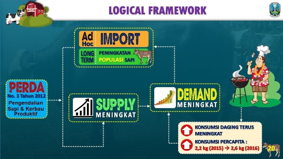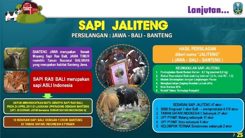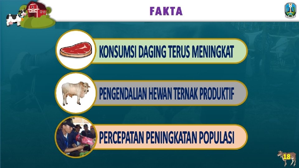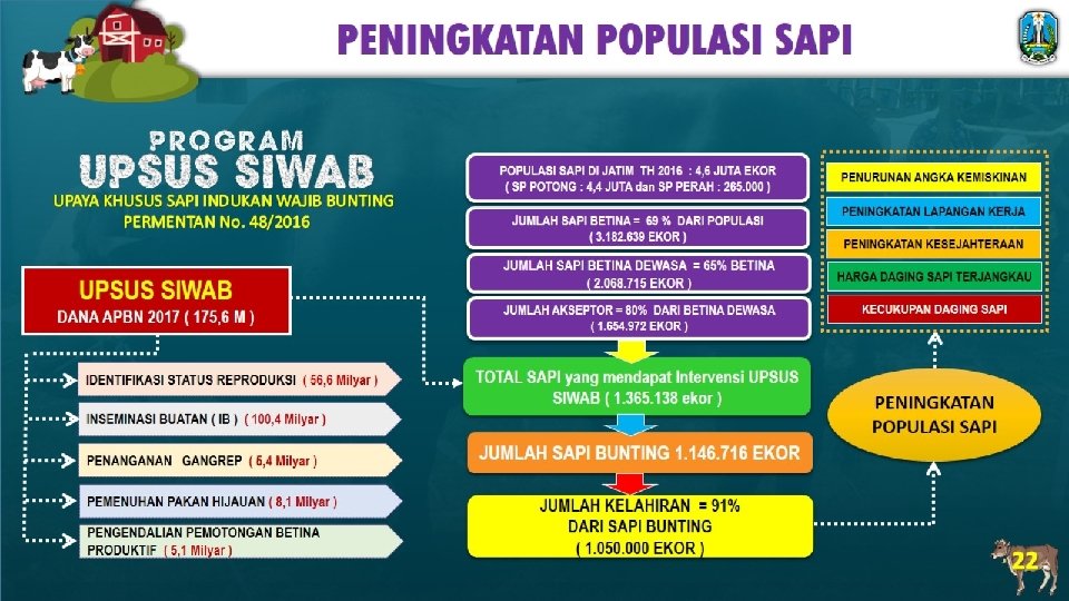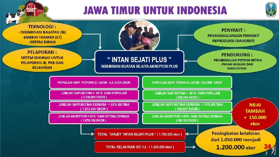 BACKGROUND SOLUSI 1. Konsumsi daging sapi DARI JAWA TIMUR UNTUK NASIONAL 1. Nasional selalu meningkat; 2. Konsumsi daging sapi perkapita Nasional sebesar 2. 2, 2 kg pada tahun 2015 dan menjadi 2, 6 kg pada tahun 2016; 3. 3. Produksi daging sapi Nasional belum bisa “INTAN SEJATI PLUS” mencukupi. 1. MENINGKATKAN KELAHIRAN DARI 1. 050. 000 Terjadi ketidakseimbangan Suplay and Demand daging, sehingga HARGA daging menjadi meningkat 1. IMPORT dading sebegai solusi jangka pendek; 2. Percepatan peningkatan POPULASI sapi di Indonesia sebagai solusi jangka panjang EKOR MENJADI 1. 250. 000 EKOR “BUDIDAYA SAPI BAKALAN” MENINGKATKAN PRODUKSI DAGING SAPI DARI 97. 000 TON MENJADI 120. 000 TON IMPACT Penambahan populasi sapi 250. 000 ekor - INTAN SEJATI PLUS 150. 000 ekor - SAPI BAKALAN 100. 000 ekor Peningkataan populasi sapi dari 4, 6 juta menjadi 5 juta ekor Peningkatan produksi daging. Harga daging sapi STABIL dan terjangkau 2. Import daging sapi menurun Tersedia bahan baku BIOGAS energi baru terbarukan dan KOMPOS pupuk organik ramah lingkungan 1. Peningkatan lapangan kerja 2. Peningkatan Kesejahteraan peternak 3. Penurunan masyarakat kemiskinan