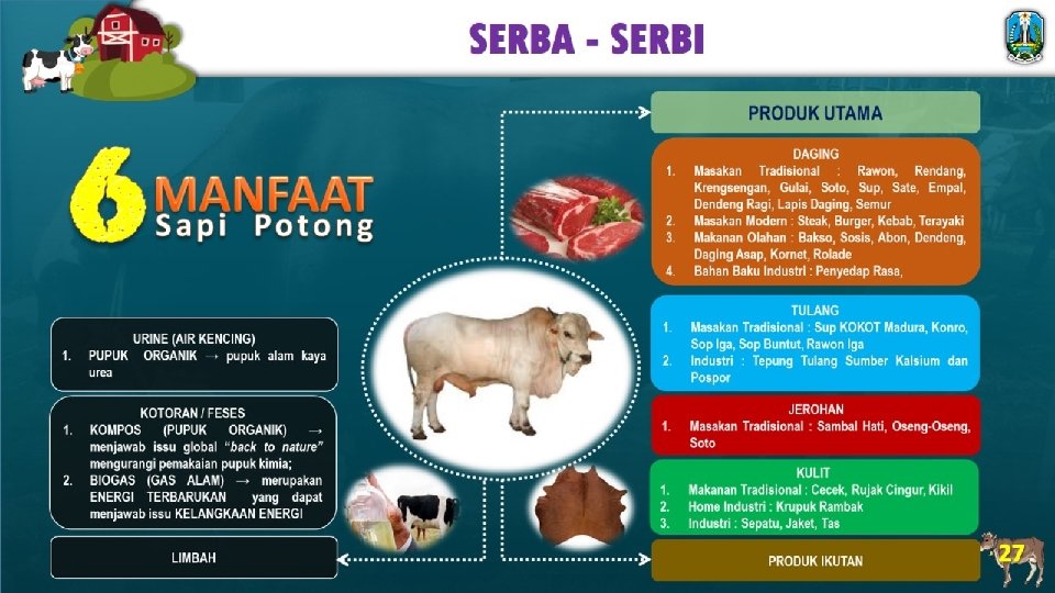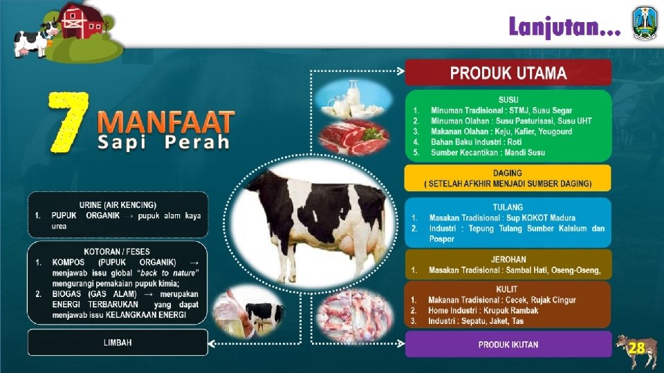 program NILAI TAMBAH PRIORITAS KOMODITI PETERNAKAN NILAI TAMBAH KOMODITIPETERNAKAN SUB SEKTOR PETERNAKAN UNGGAS 1. 2. 3. 4. 5. 6. 7. Intervensi Pengendalian Penyakit (Kompartemen Bebas Flu Burung ) → nilai tambah 123 % Ayam Pedaging : Industri Pengolahan (Nugget, Sosis, Bakso) → nilai tambah 209 % Ayam Petelur : Industri Pengolahan (Roti, Tepung Telur) → nilai tambah 267 % Pembibitan Unggas : Agri Industri (Day Old Chicken atau Anak Ayam) → nilai tambah 250 % Pengolahan Limbah (BULU ayam menjadi tepung bulu yang dapat digunakan sebagai bahan pakan ternak) → nilai tambah 1. 125 % PETERNAKAN SAPI POTONG Pengolahan Limbah (KOMPOS pupuk organik) → nilai tambah 350 % Intervensi Pengendalian Penyakit (BEBAS PENYAKIT ANTHRAK ) → nilai tambah 123 % Industri Pengolahan Daging (nugget, sosis, bakso) → nilai tambah 209 % Pembibitan Sapi Potong (Sertifikat Layak Bibit) → nilai tambah 100 % Agri Industri (SAPI WAGYU) → nilai tambah 976 % Pengolahan Limbah (KOMPOS pupuk organik) → nilai tambah 350 % Pengolahan Limbah (BIOGAS) → nilai tambah 750 % → sumber ENERGI TERBARUKAN Pengolahan Limbah (KULIT menjadi produk Industri) → nilai tambah 1. 125 PETERNAKAN SAPI PERAH % Intervensi Pengendalian Penyakit (BEBAS BRUCELLOSIS ) → nilai tambah 123 % Industri Pengolahan (Susu Olahan, Keju, Es Cream) → nilai tambah 209 % Pembibitan Sapi Perah (Sertifikat Layak Bibit) → nilai tambah 100 % Agri Industri (HULU ke HILIR) → nilai tambah 309 % Pengolahan Limbah (KOMPOS pupuk organik) → nilai tambah 350 % Pengolahan Limbah (BIOGAS) → nilai tambah 750 % → sumber ENERGI TERBARUKAN Pengolahan Limbah (KULIT menjadi produk Industri) → nilai tambah 1. 125