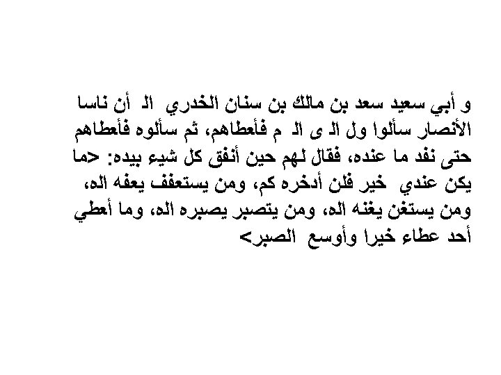 Part 2: Matan / Content • Ada beberapa orang dari kaum Anshar meminta – sedekah – kepada Rasulullah s. a. w. , lalu beliau memberikan sesuatu pada mereka itu, kemudian mereka meminta lagi dan beliau pun memberinya pula sehingga habislah harta yang ada di sisinya, kemudian setelah habis membelanjakan segala sesuatu dengan tangannya itu beliau bersabda: “Apa saja kebaikan – yakni harta – yang ada di sisiku, maka tidak sekali-kali akan kusimpan sehingga tidak kuberikan padamu semua, tetapi oleh sebab sudah habis, maka tidak ada yang dapat diberikan. Barangsiapa yang menjaga diri – dari meminta-minta pada orang lain, maka akan diberi rezeki kepuasan oleh Allah dan barangsiapa yang merasa dirinya cukup maka akan diberi kekayaan oleh Allah – kaya hati dan jiwa – dan barangsiapa yang berlaku sabar maka akan dikarunia kesabaran oleh Allah. Tiada seorangpun yang dikaruniai suatu pemberian yang lebih baik serta lebih luas – kegunaannya – daripada karunia kesabaran itu. ” (Muttafaq ‘alaih)