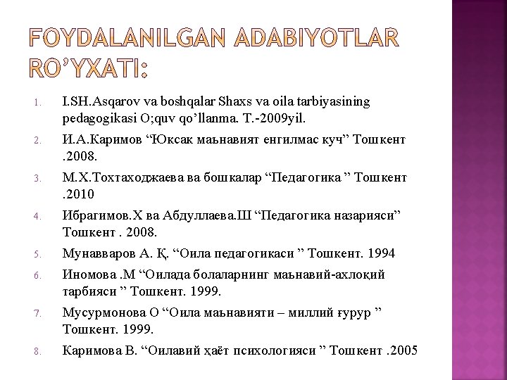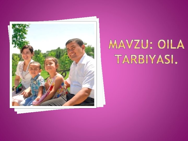 RЕJА: 1. Oila, uning vazifalari va turlari. 2. Zamonaviy oilalar rivojining o’ziga xos xususiyatlari. 3. Ta’lim muassasasining oila bilan olib boradigan ish shakllari