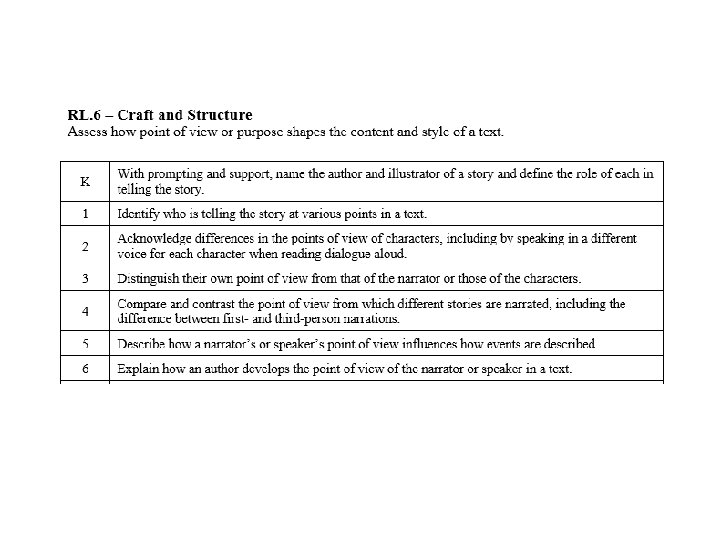 RL. 6 (Assessing how point of view or purpose shapes a text) Name The Author and Illustrator Define Their role in telling the story With prompting and support K Identify Who is telling the story at various points 1 st Acknowledge Differences in the points of view of characters Speak In different voices for each character when reading dialogue 2 nd Distinguish their own point of view from that of the narrator or those of characters 3 rd Compare & Contrast The point of view from which different stories are narrated Distinguish Between first-person and third person narration 4 th Describe How a narrator’s or speaker’s point of view influences how events are described 5 th