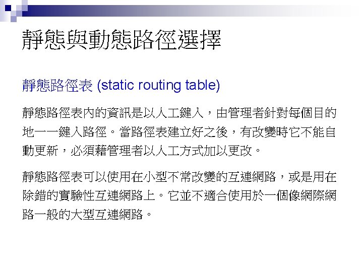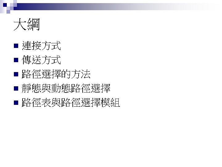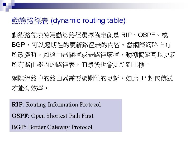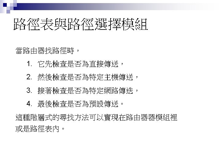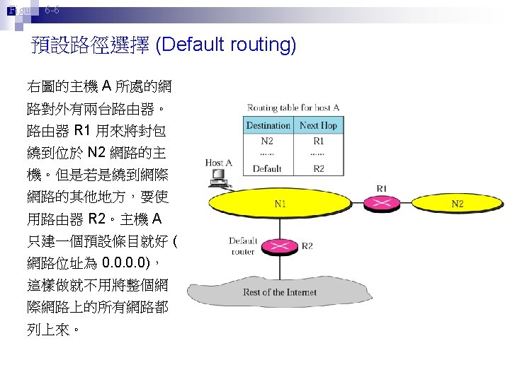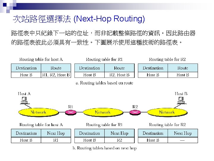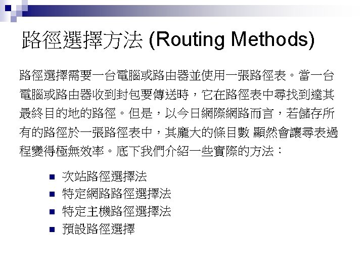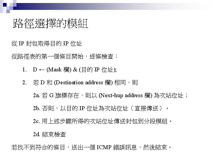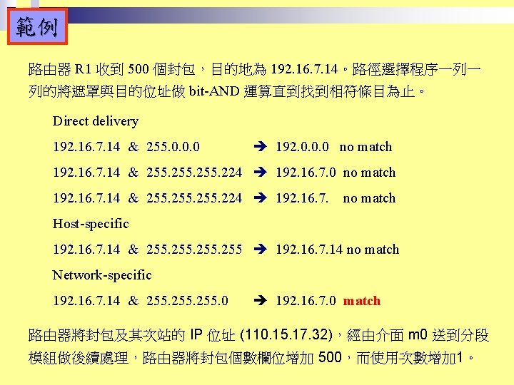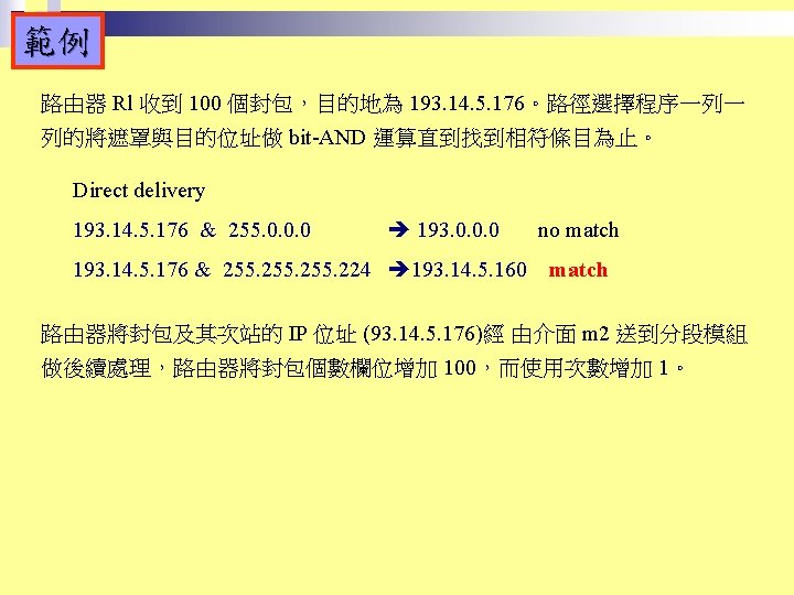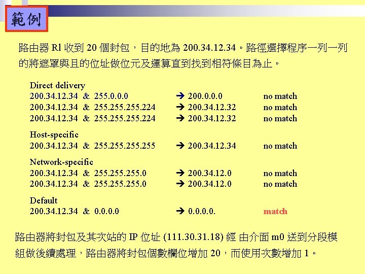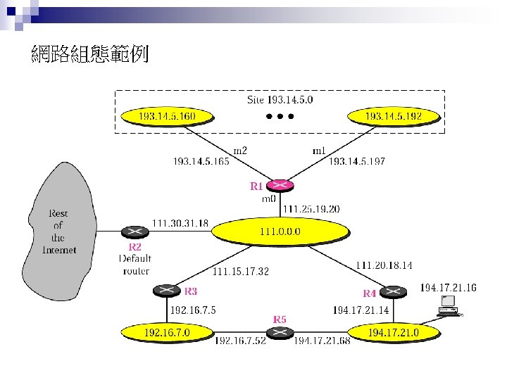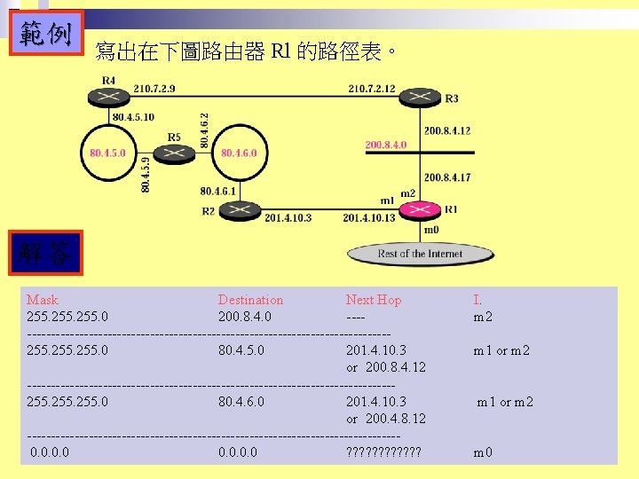 Rl Mask Dest Next Hop 255 0 0 Slides: 26 Download presentation 路由器 Rl 的路徑表 Mask Dest. Next Hop 255. 0. 0. 0 111. 0. 0. 0 255. 224 193. 14. 5. 160 255. 224 193. 14. 5. 192 --------------------------------------------------255. 255 194. 17. 21. 16 111. 20. 18. 14 --------------------------------------------------255. 0 192. 16. 7. 0 111. 15. 17. 32 255. 0 194. 17. 21. 0 111. 20. 18. 14 --------------------------------------------------0. 0 111. 30. 31. 18 F U U U I. m 0 m 2 m 1 UGH m 0 UG UG m 0 範例 寫出在下圖路由器 Rl 的路徑表。 解答 Mask Destination Next Hop I. 255. 0. 0 134. 18. 0. 0 -- m 0 255. 0. 0 129. 8. 0. 0 222. 13. 16. 40 m 1 255. 0 220. 3. 6. 0 222. 13. 16. 40 m 1 0. 0 134. 18. 5. 2 m 0 範例 路由器 R 1 的路徑表秀在下表,畫出它的網路連接圖。 Mask Destination Next Hop I. 255. 0. 0 110. 70. 0. 0 - m 0 255. 0. 0 180. 14. 0. 0 - m 2 255. 0. 0 190. 17. 0. 0 - m 1 255. 0. 0 130. 4. 0. 0 190. 17. 6. 5 m 1 255. 0. 0 140. 6. 0. 0 180. 14. 2. 5 m 2 0. 0 110. 70. 4. 6 m 0
