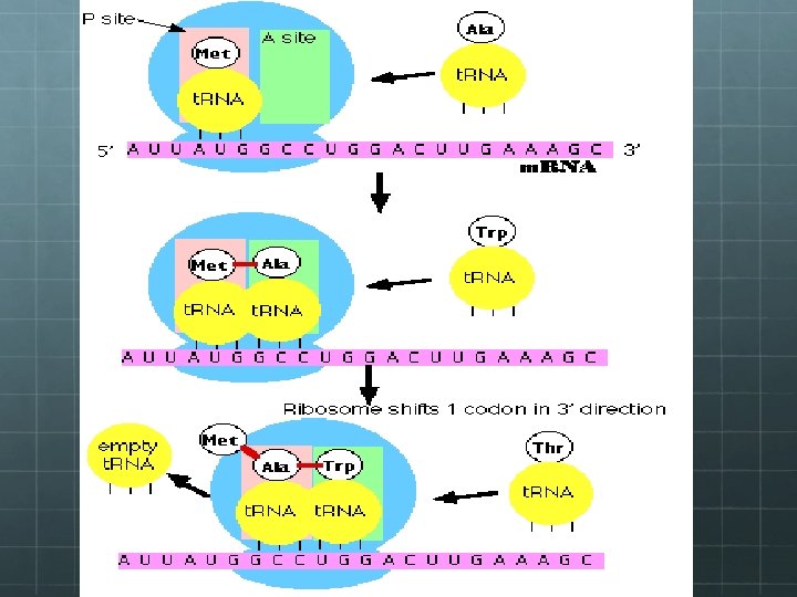 Steps in Translation Messenger RNA iss transcribe in the nucleus and enters the cytoplasm t. RNA- Translation begins at AUG (the start codon) As each codon passes through the ribosome, t. RNA’s bring the proper amino aids into the ribosome. The ribosome then joins two amino acids to a growing chain (polypeptide chain)