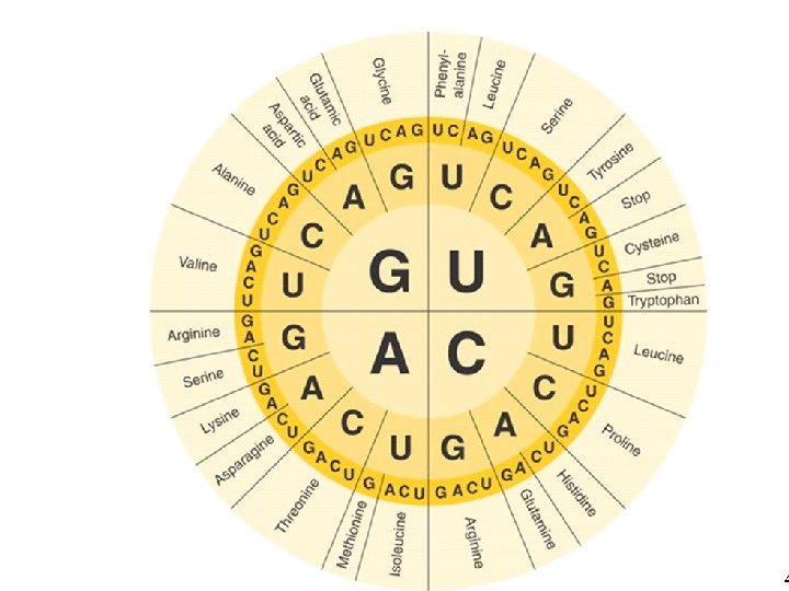 Genetic Code • The genetic code is the “language” of m. RNA instructions. • The code is written using four “letters” (the bases: A, U, C, and G). • A codon consists of three consecutive nucleotides on m. RNA that specify a particular amino acid.