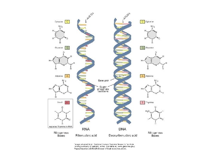 RNA • • Compare RNA to DNA Different sugar (ribose) Single strand instead of double 1 different nitrogen base – Uracil is in RNA, Thymine is not