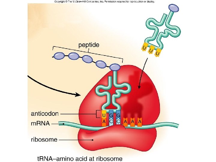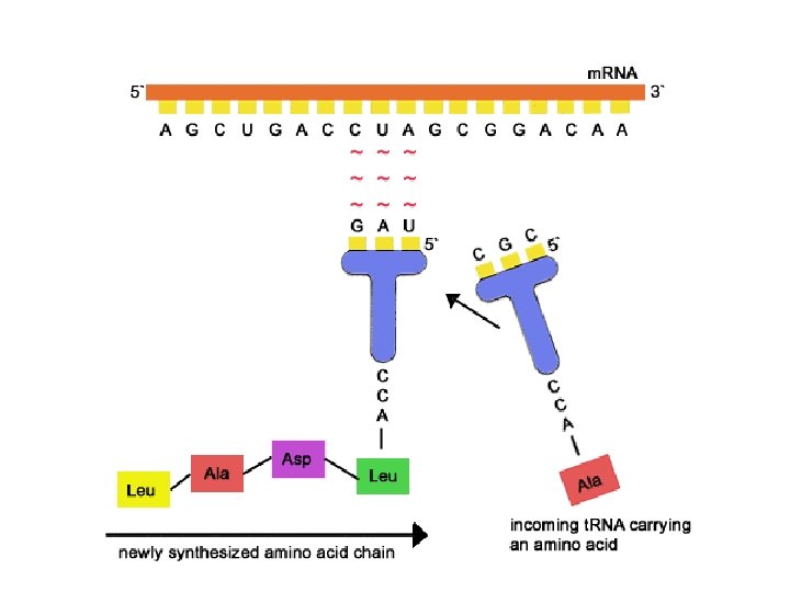 • 1. There are over 64 possibilities of codons but only 20 amino acids so many codons may read for the same amino acid. • 2. There is also a very specific codon (AUG) that is known as a start/stop codon that starts/ends protein synthesis – Ex. DNA Sequence: AGC GTG m. RNA Sequence codon: UCG CAC Amino Acid that will match: Serine Histidine