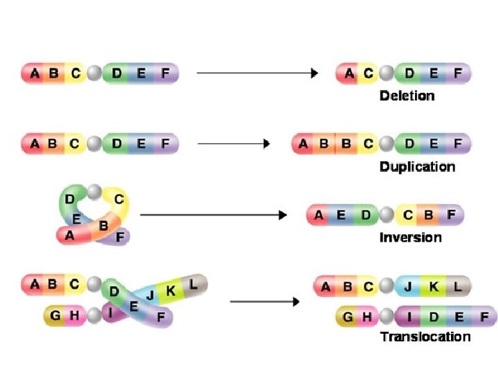 IIX. Mutations • A. Mutations are changes in the genetic material. • B. 2 types of mutations: – 1. Gene mutations – changes in a few nucleotides can cause either point mutations or frameshift mutations • Ex. TAC GCA -> AUG CGU -> Met Arg • TAC GTA -> AUG CAU -> Met His – 2. Chromosomal mutations – changes in the structure of the chromosome caused by deletion, duplication, inversion, translocation
