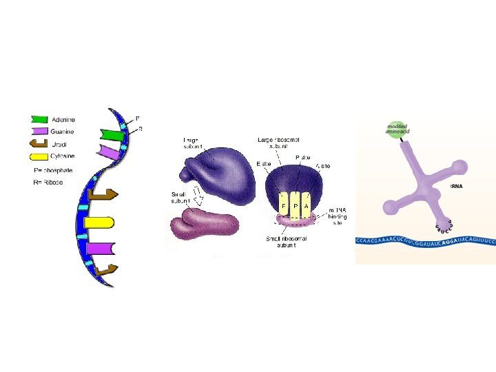 III. Types of RNA • A. There are 3 main types of RNA: – 1. messenger RNA – carry the copy of DNA to the rest of the cell (m. RNA) – 2. ribosomal RNA – make up ribosomes which make proteins (r. RNA) – 3. transfer RNA – carry an amino acid to the ribosome (t. RNA) • B. The 3 types of RNA play a key role in protein synthesis