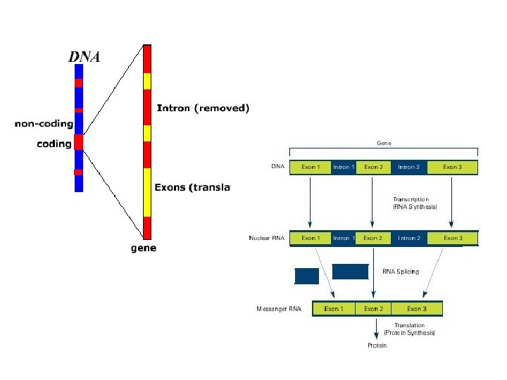 V. RNA Editing • A. RNA molecule require a little bit of editing getting copied directly from DNA. • B. DNA in eukaryotic cells have sections of nucleotides called introns that are not involved in coding for proteins • C. The sequences that code for proteins on DNA are known as exons. (expressing sections) • D. Prior to leaving the nucleus the introns are cut out and the exons are spliced back together