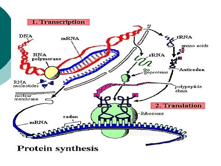 Translation: ¡ m. RNA leaves the nucleus and goes to the ribosome. ¡ At the ribosome, a specific protein is made. ¡ This is done by t. RNA adding amino acids to a growing chain. ¡ http: //library. thinkquest. org/20465/g_D NATranscription. html ¡