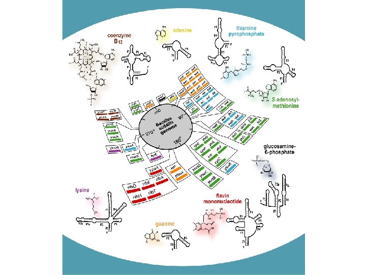 RNA Switches • RNA switches are m. RNAs that sense the environment directly, shutting themselves down in response to particular chemical clues. • Breaker, Nudler, Yura and Cossart laboratories report that specific RNA sequences can act as environmental sensors of vitamin cofactors (including vitamins B 1, B 2 and B 12) and temperature, which allow them to directly regulate the transcription or translation of associated m. RNAs.