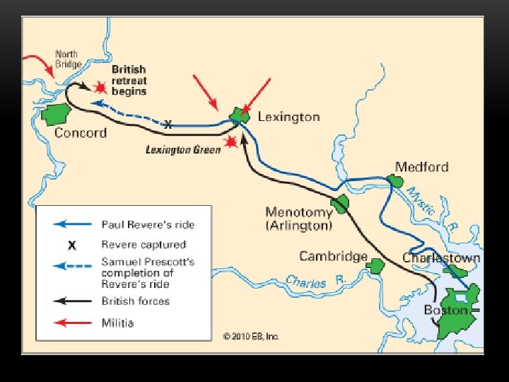 Fighting at Lexington and Concord: • Patriots: followed call of 1 st Continental Congress • Mass. Pats formed militias and began to gather guns (Concord, Mass) • April 18, 1775: 800 British troops moved out of Boston and marched to Concord (Seize supplies) • Paul Revere, William Dawes, and Dr. Samuel Prescott: on horseback through countryside to warn that “The British were coming” • Destroyed some militia’s supplies • As troops returned to Boston, 4, 000 Patriots gathered along road shoot At them from behind trees and stone walls. • British: 70 killed, 170 wounded • Patriots: 90 killed, wounded, or missing • REVOLUTIONARY WAR HAS BEGUN