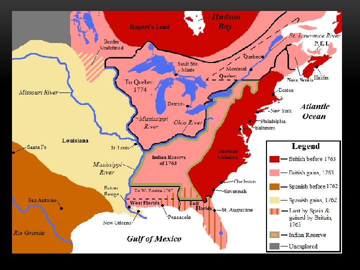 TREATY OF PARIS • 1763: Reps from Great Britain, France, and Spain signed treaty in Paris • Ended: • French and Indian War (Colonies) • Seven Years War (Europe) • France turns over present-day Canada over to Britain • France surrenders all land east of Mississippi River • New Orleans: Given to Spain through secret treaty a year earlier • British trade Cuba to Spain for Florida