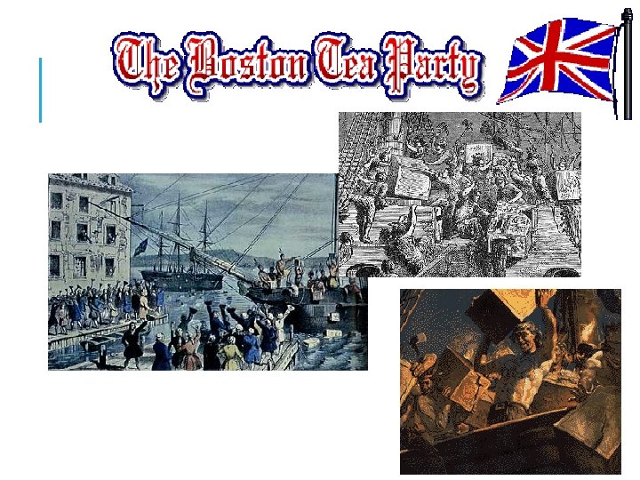 THE TEA ACT 1773 British Action: says colonials can only buy tea from East India Company (shuts out colonial tea merchants) Colonial Reaction: The Boston Tea Party Colonists in Boston rebel, dumping 15, 000 pounds of East India Company tea into Boston Harbor
