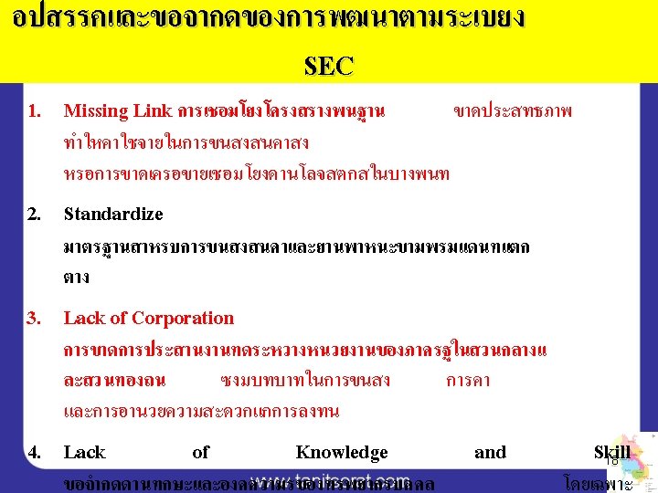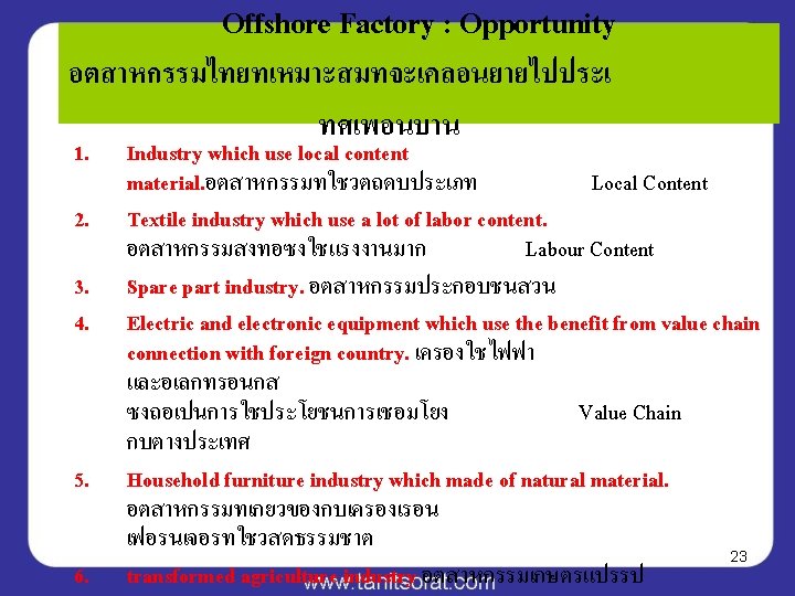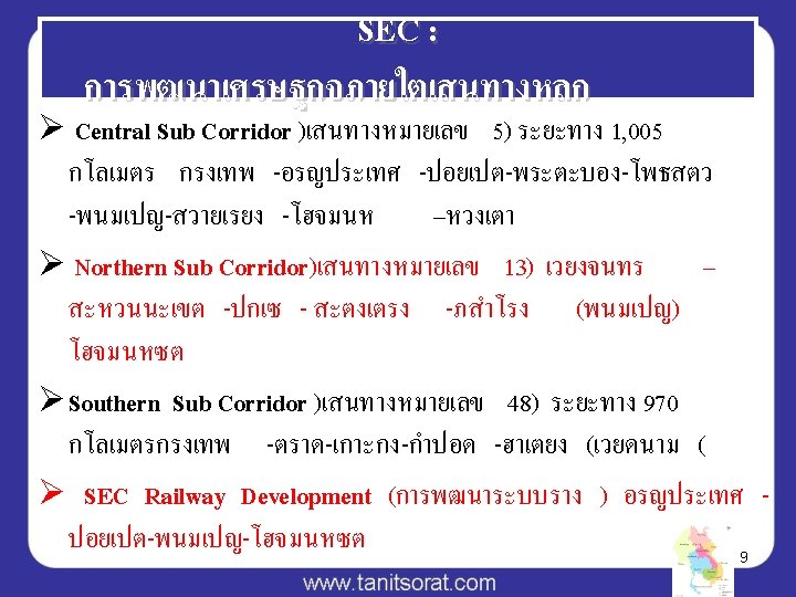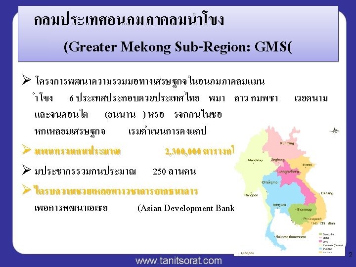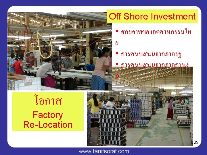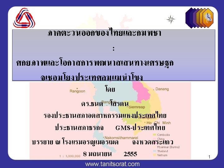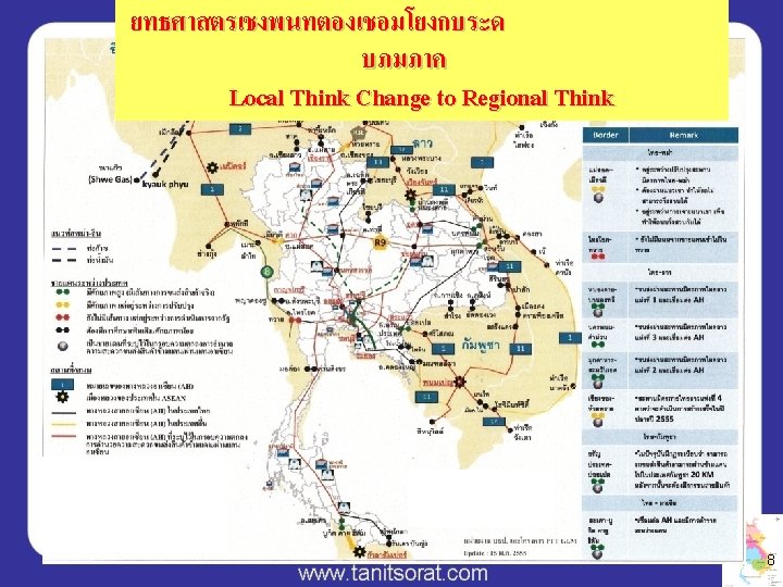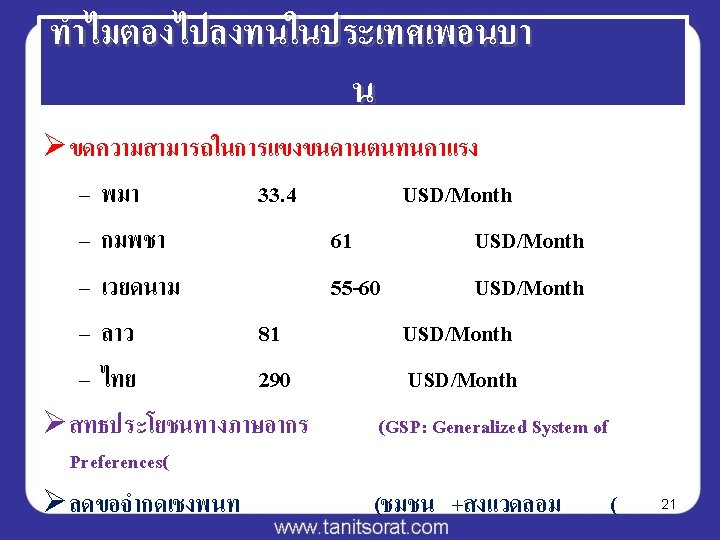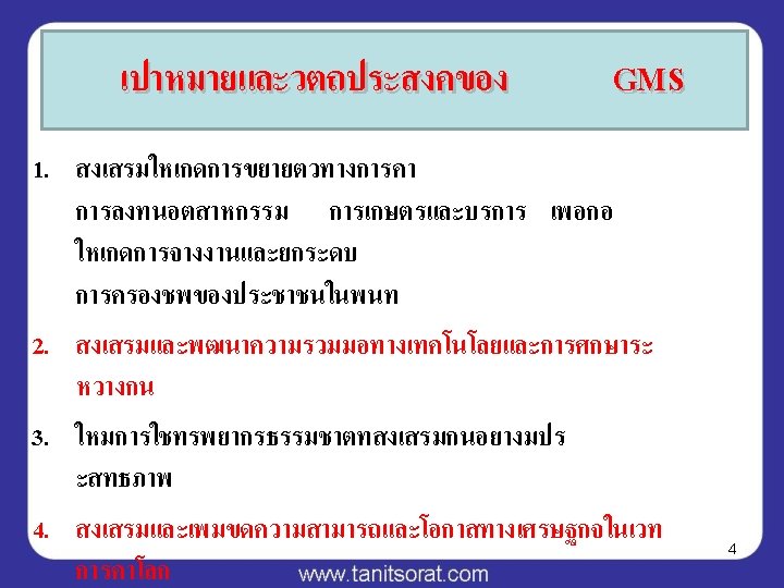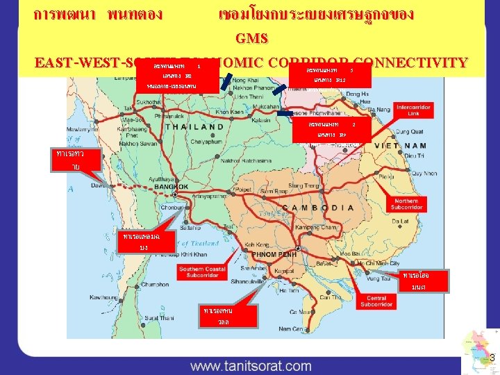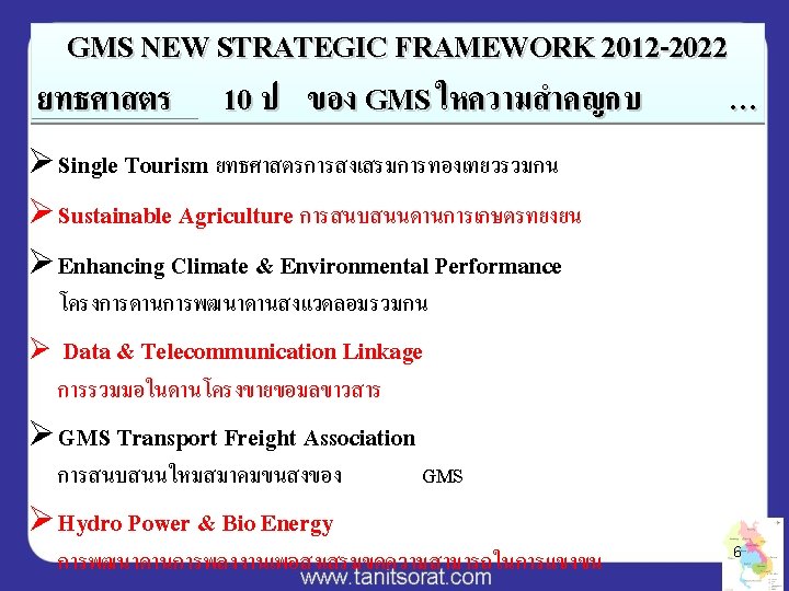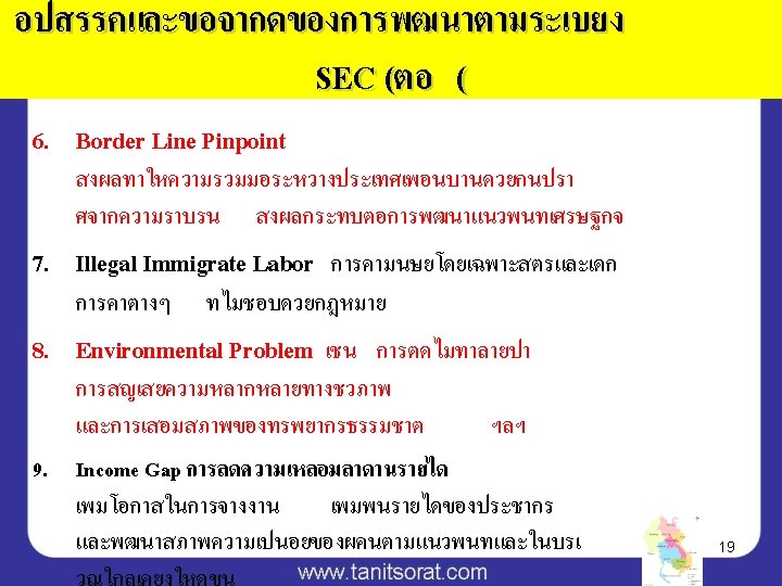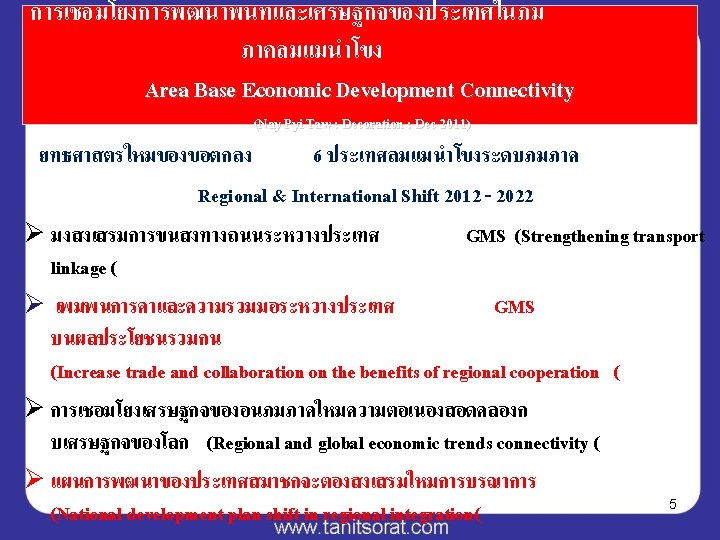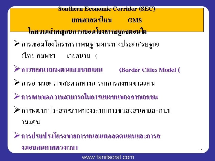 GMS+AEC : จดเปลยนประเทศไทย โอกาสและความทาทาย AEC Country to Countries GMS Border Cities To Border Cities Free Trade Logistics Hub Finance Free neighbor Investment Free Co-Tourism Cross border Trade Immigrant Labour Border Special Economic Zone www. tanitsorat. com 20 Skill Labour Free 20
