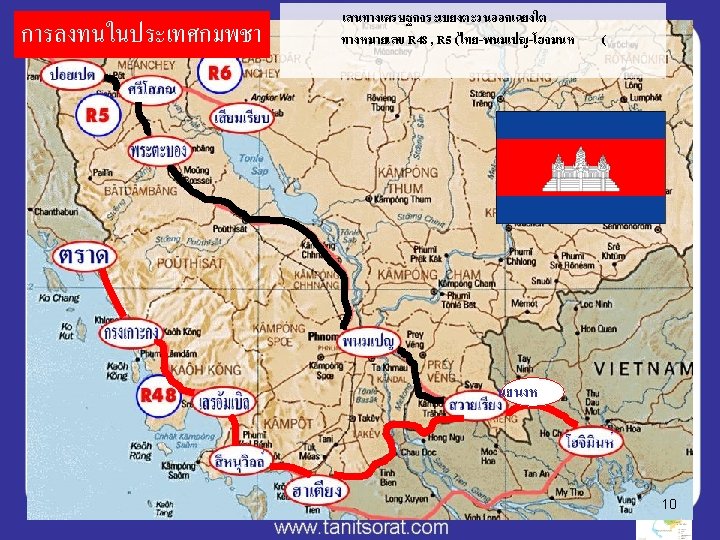 พนทการเชอมโยงเศรษฐกจภายใตประเทศในอนภมภาคแมนำโขง Road Upgrading of East-West Economic Corridor ・National Route 9 (Lao PDR): Exchange of Note (E/N) on grant assistance for route maintenance amounting 3. 27 billion yen was signed in Aug 2011 Road Upgrading of North-South Economic Corridor • National Route 11 (Lao PDR): Through Thailand’s assistance, construction was commenced in May 2011 for 82 km in ・Japan provides yen loans for the construction of North-South Highway (Ho Chi Minh City – Daw Giay, Danang – Quang Ngai) total. Including 56 km main route and 26 km sub route • Japan conducted detailed development survey for North-South Speed Railway • 1 st Thailand-Myanmar Friendship Bridge: Thailand has started rehabilitation since 2011 • 2 nd Thailand-Myanmar Friendship Bridge: Site selection has been proceeding by Thailand Myanmar Lach Huyen Seaport and its access road to Hanoi Thilawa Industrial Zone ・ Located near Yangon with Myanmar’s keen interests Myanmar ・ Japan and Viet Nam signed Exchange Note (E/N) and Loan Agreement (L/A) in October 2011 • Funded by Viet Nam, Hanoi-Hai Phong Hignway is under • In Feasibility Study (F/S) stage and to be developed by construction, targeting completion by the end of 2014 Vung Ang Seaport and its access road to 3 rd Mekong Bridge Dawei Seaport and its access road to Thai border ・Connecting Road from Vientiane to Viet Nam border was constructed with international standard • Vung Ang Seaport has commenced its operation by joint venture management company financed by Viet Nam and Lao PDR ・ Thailand Myanmar have been jointly proceeding the development • the access road to Dawei was officially recognized as a part of South Economic Corridor at ADB GMS Summit in 2011 Completed 3 rd Mekong Bridge Development of Thai-Myanmar border ・Supported by Thailand, the bridge was constructed and start operation on 11 th November 2011 ・ Thailand has been promoting the development of Thai. Myanmar border including Kanchanaburi area Neak Loeung Bridge ・ Funded by JICA, bridge construction was started in February 2011, to be completed in March 2015. Ranong Seaport and its access road to Bangkok ・ Access road to Bangkok has been well-maintained by Thailand Cai Mep-Thi Vai Seaport and its access road to HCMC • Port capacity should be strengthened for further utilization ・ Port construction was commenced in October 2008, to be completed in November 2013 Koh Kong Industrial Zone ・ Industrial Park in the border area between Thailand Cambodia • Already developed and additional electricity supply is under consideration Road Upgrading of Southern Economic Corridor ・National Route 1 (Cambodia): Grant assistance for upgrading the route has been provided since 2005, and preparatory survey on Phase 4 construction was conducted in Sept 2011 • National Route 5 (Cambodia): Preparatory survey on upgrading the road will be completed in Apr 2012 Projects under MJ-CI Action Plan Newly Emerging Development Plans