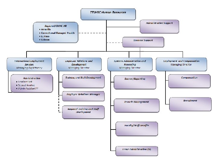 Work Alignment HR Lubbock office structure will change to better support HR regional offices, faculty and staff and the Lubbock campus More emphasis put on employee relations management, training and organizational development Streamline processes Improved efficiency Leverage HR resources across campuses