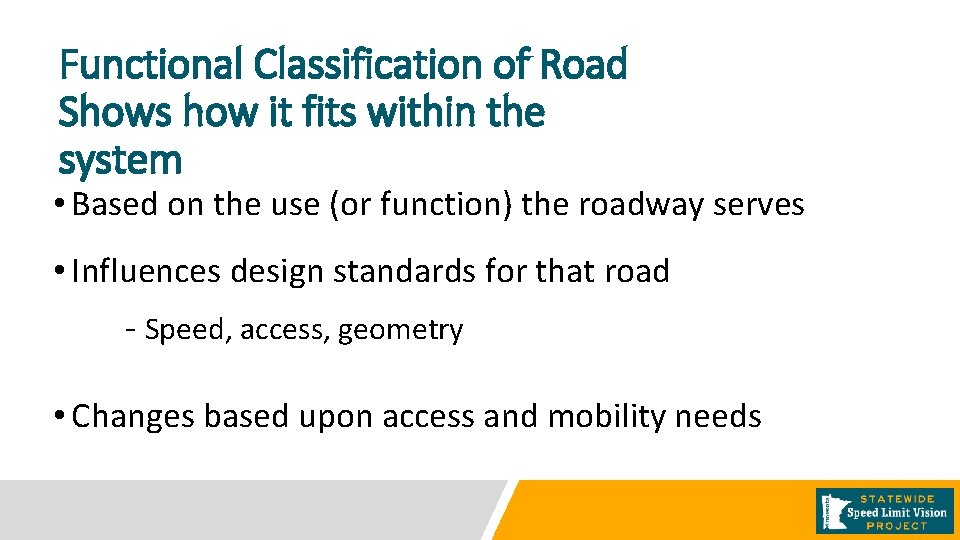 Why Functional Classification is important to speed limit vision discussion • Shows how road fits within entire system • Influences design standards such as speed, access and geometry • Higher level roads important part of road system as they move the highest number of vehicles • Higher level road move more traffic and need higher speeds, access control, and more travel lanes to do so • Access Reduces and Mobility Increases as level of road increases • Vision for speed limits should differ for roadways with different functions in the road system