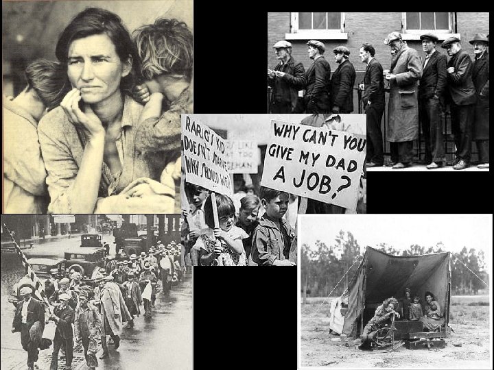 Overproduction Cause Effect Agriculture • In the 1920’s, many farmers produced record numbers of agriculture products leading to a dramatic drop in the price. • This limited the profit for farmers. • Then, the drought in 1930’s caused many farmers to have to leave their land Industry • Industry soared before the Wall Street Crash with many purchasing on credit. • Production continued at fast pace, but the market quickly dried up • Too many products were being produced with too few people buying them. • Layoffs continues when people were unable to pay back