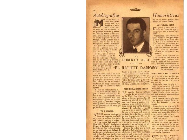 lecturas Novela: El juguete rabioso (primer cap. „Los ladrones“) Los siete locos Cap. 1 La sorpresa Cap. 3 La farsa http: //biblio 3. url. edu. gt/Libros/roberto/los-7 -locos. pdf Los lanzallamas Haffner cae La agonía del Rufián Melancólico Cuentos: http: //www. ciudadseva. com/textos/cuentos/esp/arlt/ra. htm Las fieras El jorobadito Teatro: El fabricante de fantasmas
