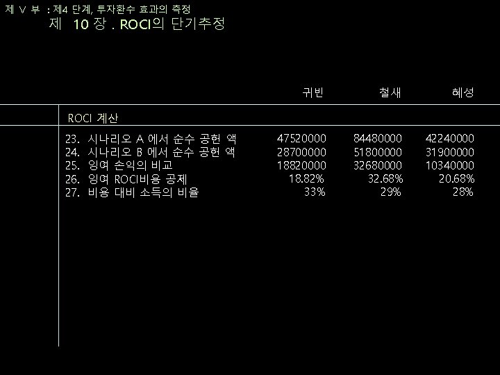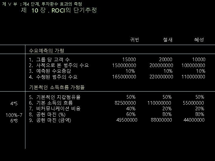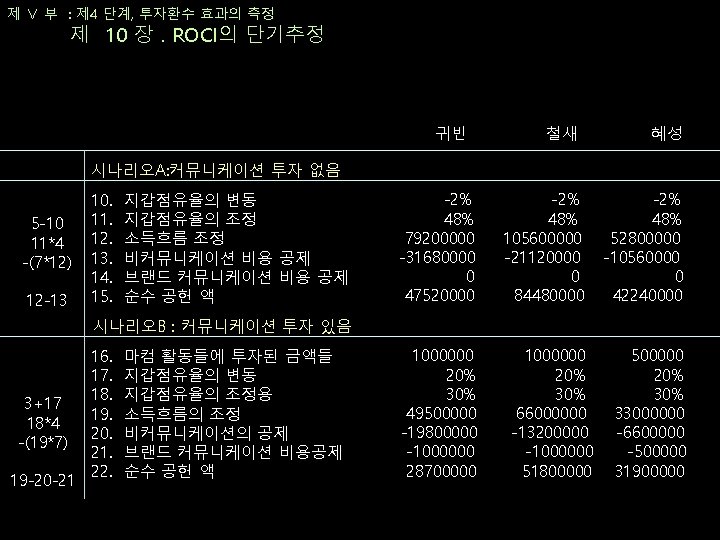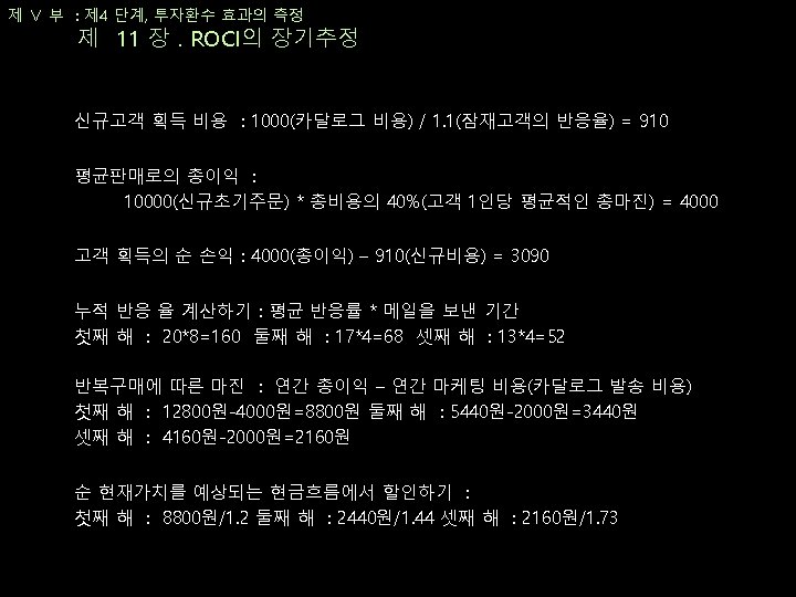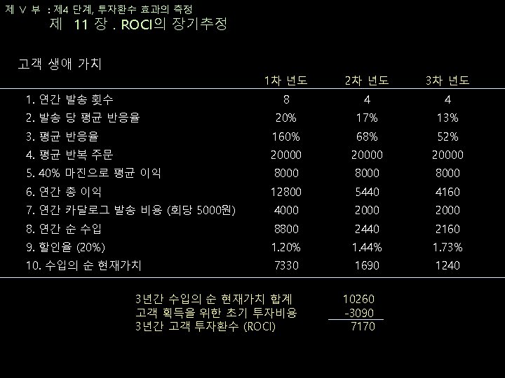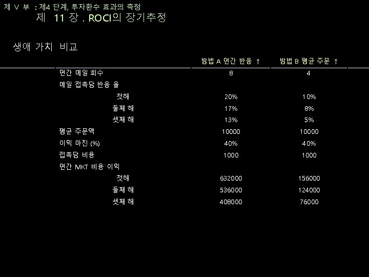 제 Ⅴ 부 : 제 4 단계, 투자환수 효과의 측정 제 10 장. ROCI의 단기추정 ROCI 그룹 마콤 노력 제안된 예산 측정된 매출성장 140% A MD 발송 1000000 3000000 250% A 점포 내 프로모션 2000000 5000000 450% A Personal 관계 유지 1000000 3000000 그룹 A 합계 4000000 1100000 280% 170% B VIP MD 발송 1000000 5000000 290% B Personal 관계 유지 2000000 570% B VIP 프로모션 2000000 4000000 그룹 B 합계 5000000 14000000 343%