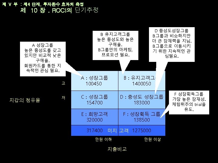 제 Ⅴ 부 : 제 4 단계, 투자환수 효과의 측정 제 10 장. ROCI의 단기추정 ROCI 그룹 마콤 노력 제안된 예산 측정된 매출성장 100% D 끈기 & 관심 1000000 1500000 140% D 포인트 제공 & 소진 1500000 4000000 250% D 내부 홍보 2000000 3000000 그룹 D합계 4500000 8500000 163% 100% F 호기심 유발 MD 발송 500000 800000 150% F 외부 홍보 2000000 4000000 200% F 체험 유도 2000000 150% 그룹 F 합계 4500000 6800000 234% 총합계 18000000 30400000