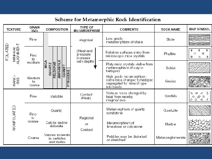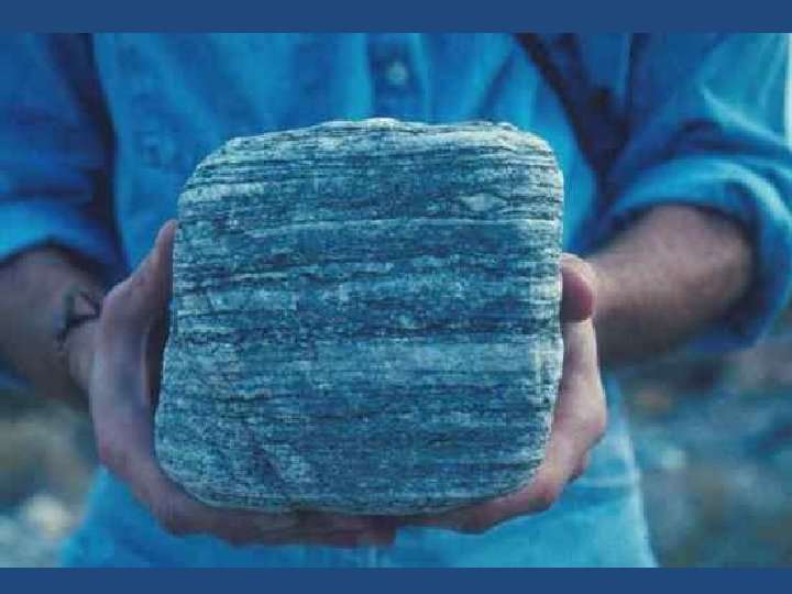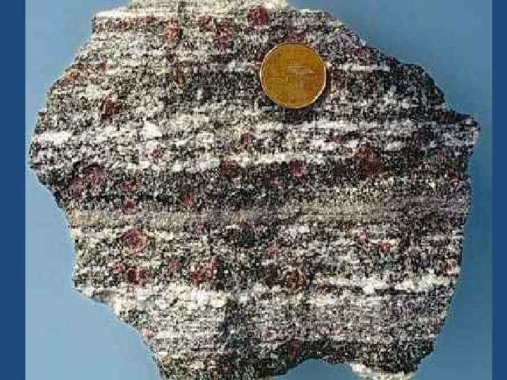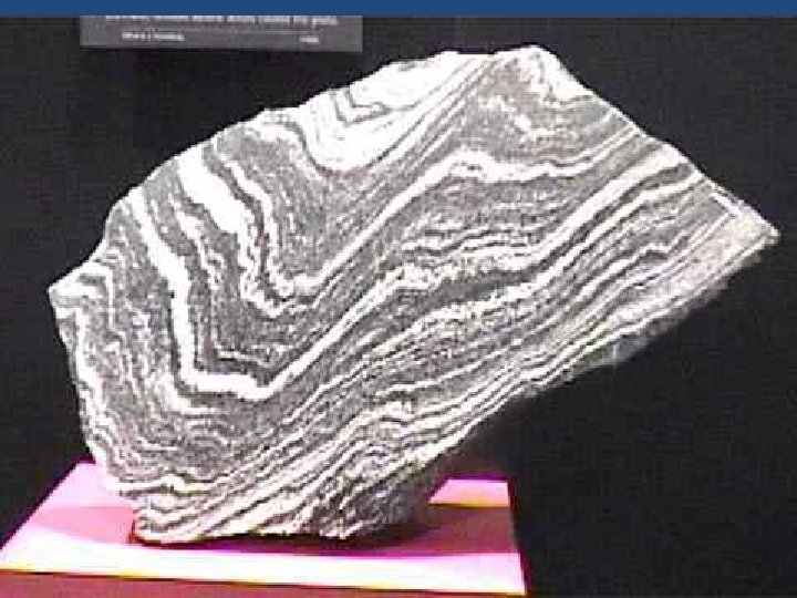 Minerals are aligned Banding, type of foliation with bands of white and black minerals Folded Layers