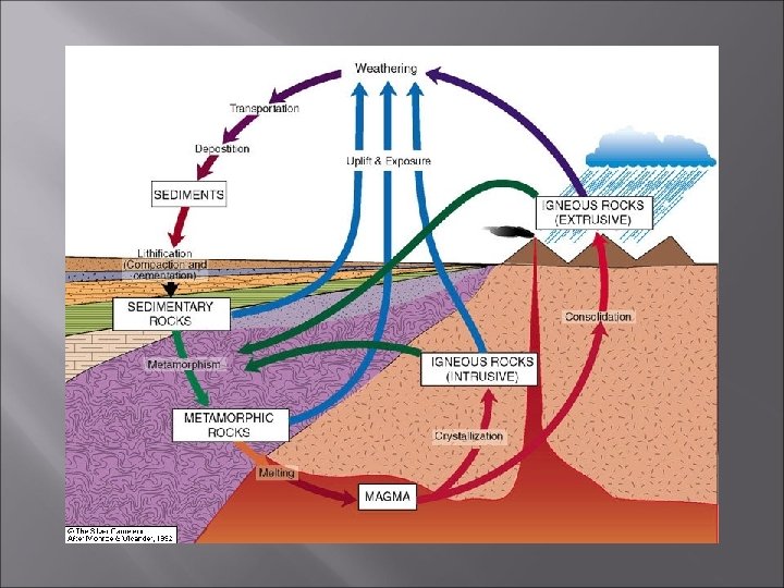 This slide show is intended to help you understand important types of rocks. The diagram in the next slide represents the ROCK CYCLE—a scheme that represents the processes of continuous changes that connect the three major groups of rocks: SEDIMENTARY IGNEOUS METAMORPHIC It also shows two other important parts of the “Rock Cycle” – SEDIMENTS and molten LAVA and MAGMA Source: http: //www. canadianrockhound. com/junior/rock_cycle. html