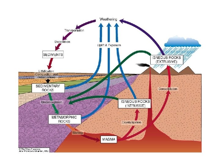 This slide show is intended to help you understand important types of rocks. The diagram in the next slide represents the ROCK CYCLE—a scheme that represents the processes of continuous changes that connect the three major groups of rocks: SEDIMENTARY IGNEOUS METAMORPHIC It also shows two other important parts of the “Rock Cycle” – SEDIMENTS and molten LAVA and MAGMA Note about image sources: Many images come from a website (Volcano World) that no longer is supported, so no credit is given. The last slide provides possible sources.