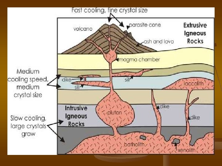 Igneous Rocks n n Rocks formed when magma and lava solidify Igneous comes from the Latin word for “fire”. Intrusive – igneous rocks from when magma cools below the Earth’s surface. n Extrusive – igneous rocks that form from lava cooling on the surface of the Earth n